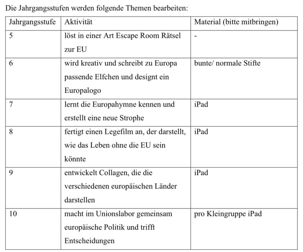 am 27.04.2026 findet der Europatag für Schulen statt. Unter dem seit 2000 bestehenden Motto „In Vielfalt geeint“ beschäftigen sich die Schüler*innen der Sekundarstufe I an diesem Tag für ungefähr eine Doppelstunde mit dem Thema „Europa“. Wir als Europaschule möchten den Einheits- und Freundschaftsgedanken erfahrbar machen, um unsere Schüler*innen auf das Leben im vereinten Europa und der Welt vorzubereiten (Anmerkung: das kommt aus der Einleitung unseres Flyers).